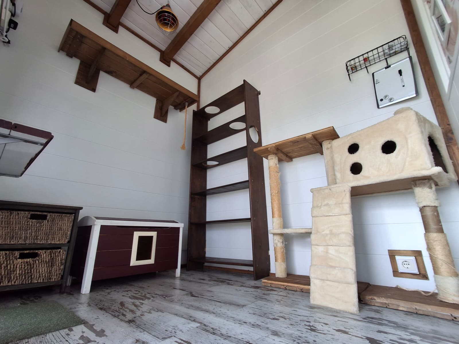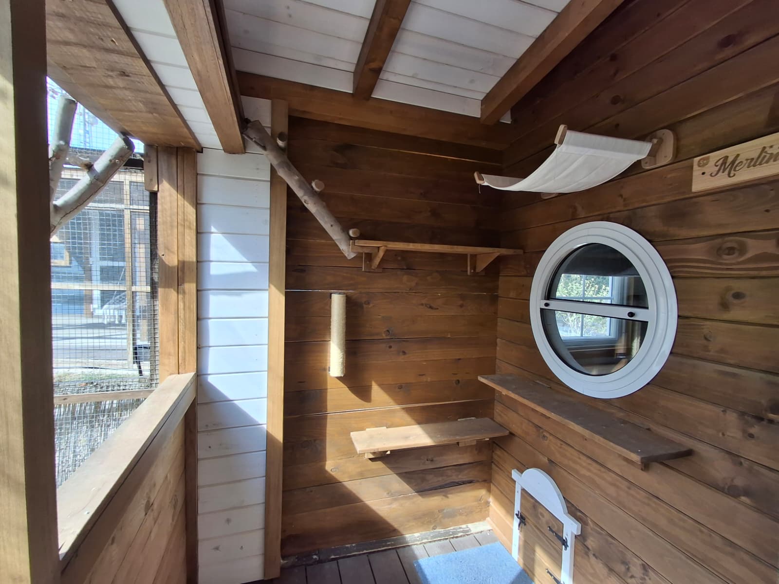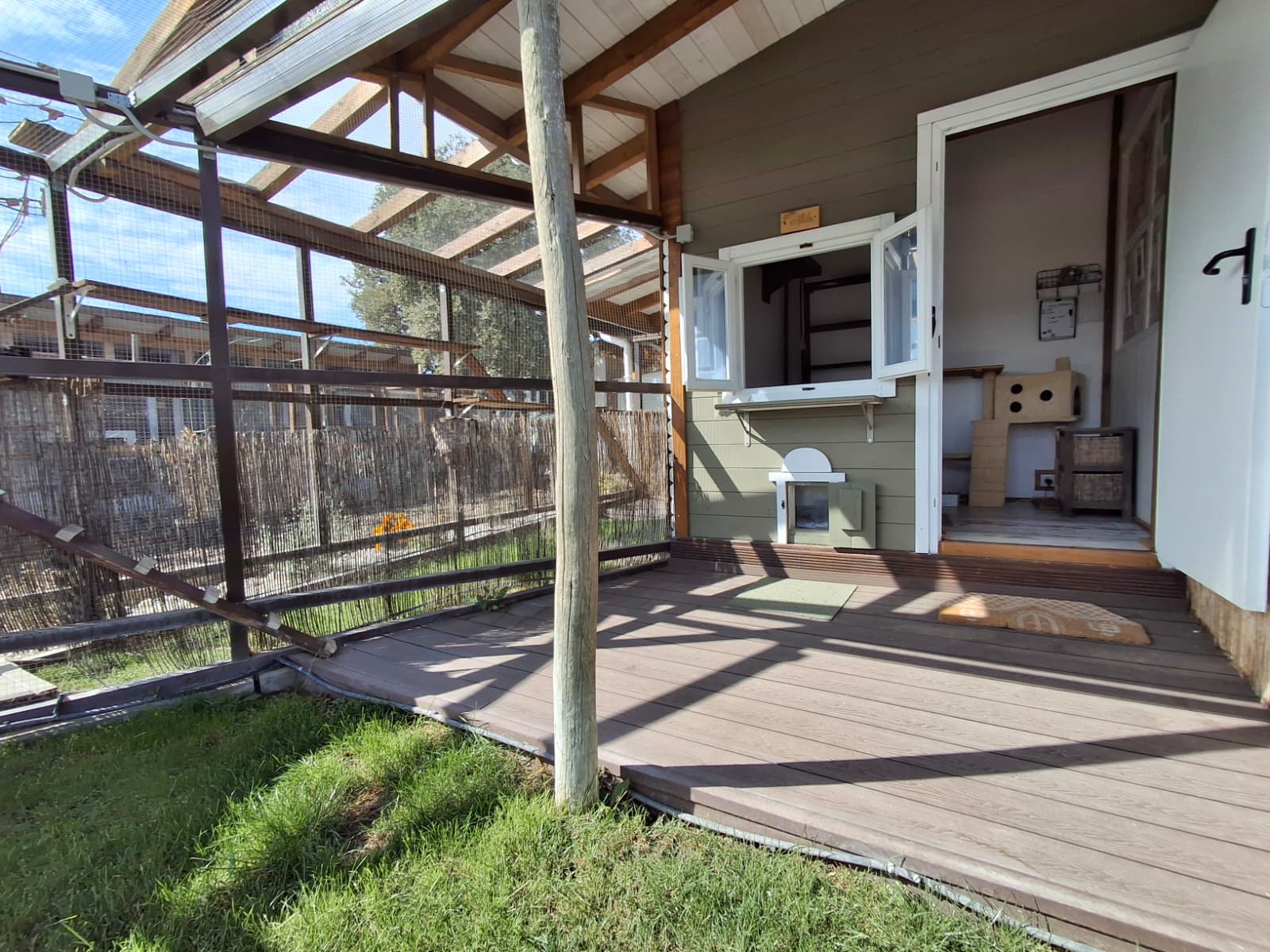 Desde la zona interior, los gatos acceden a través de una pequeña gatera a un jardín con porche de madera y césped natural, donde pueden relajarse, tomar el sol en invierno o descansar a la sombra en verano. Esta gatera puede cerrarse si se desea limitar el acceso al exterior en determinados momentos.