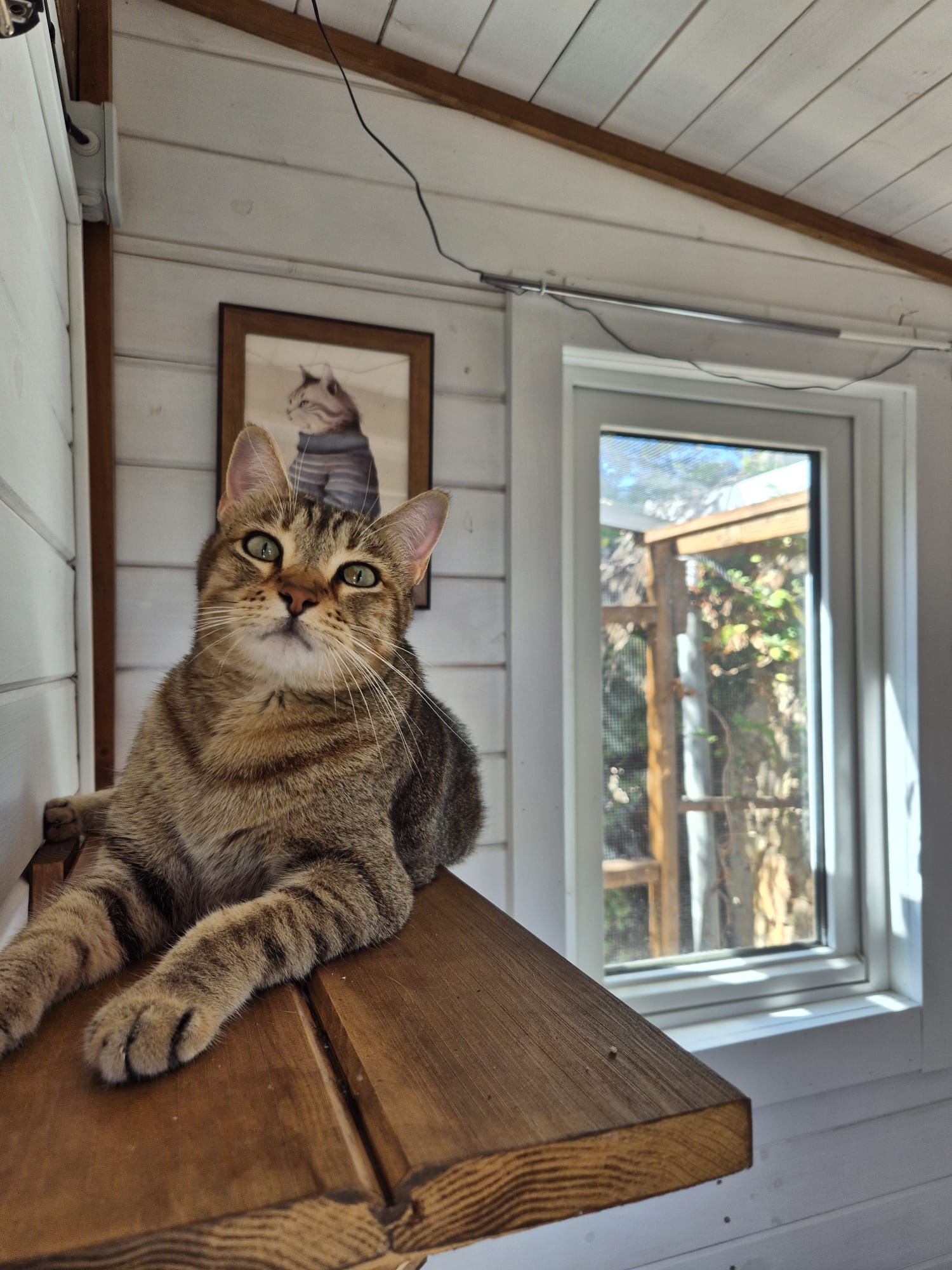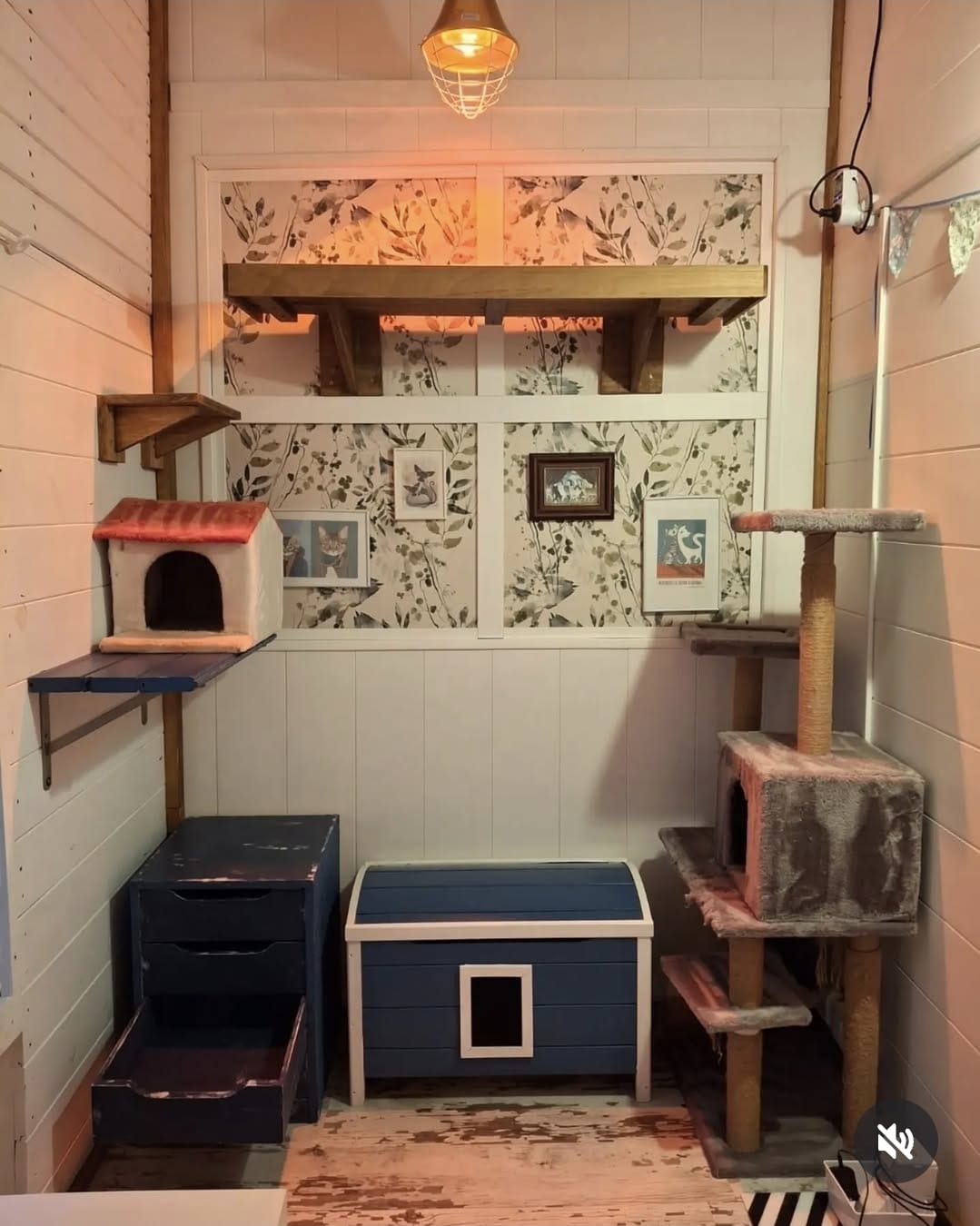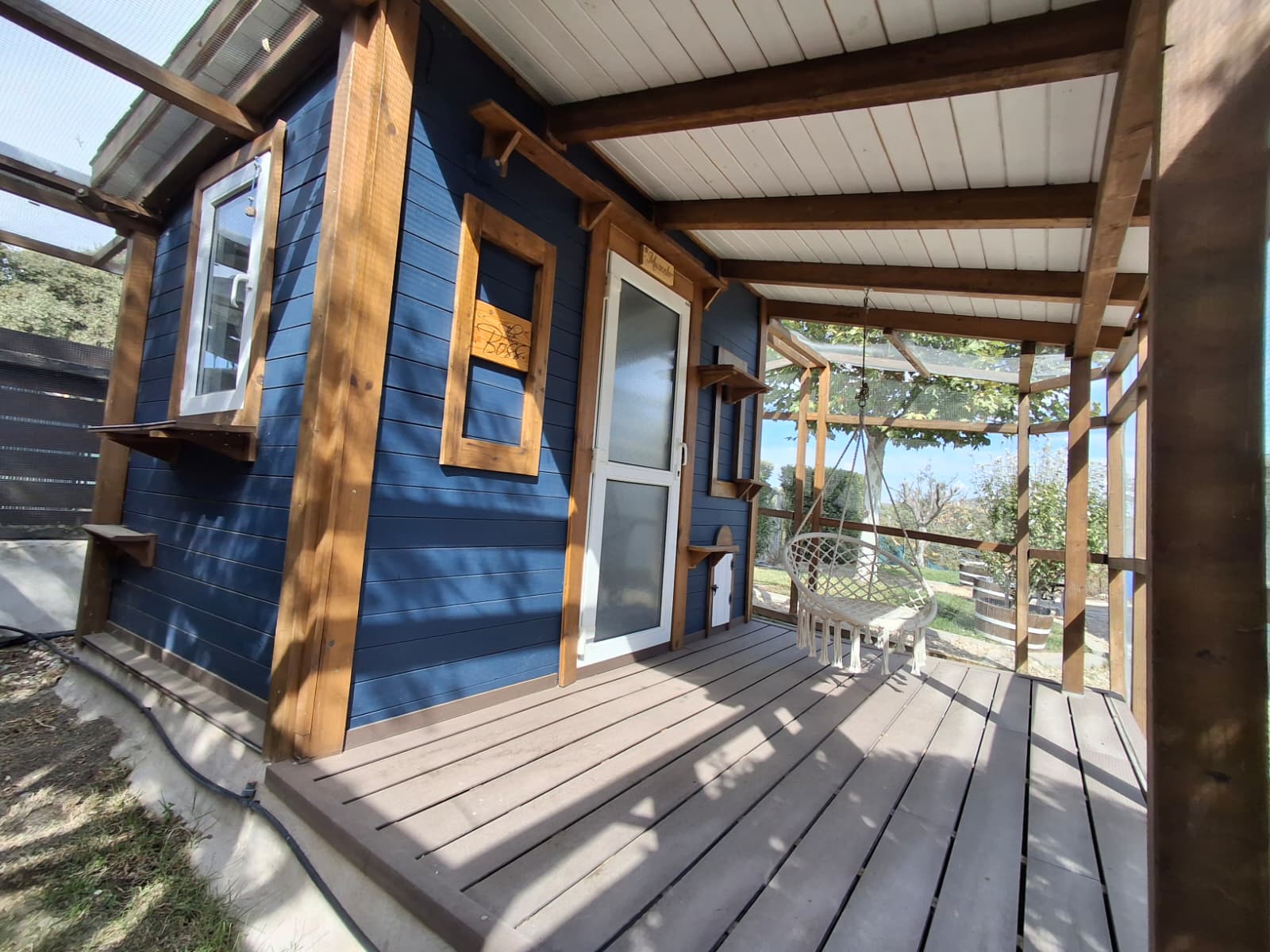 Desde la zona interior, los gatos acceden a través de una pequeña gatera a un jardín con porche de madera y césped natural, donde pueden relajarse, tomar el sol en invierno o descansar a la sombra en verano. Esta gatera puede cerrarse si se desea limitar el acceso al exterior en determinados momentos.